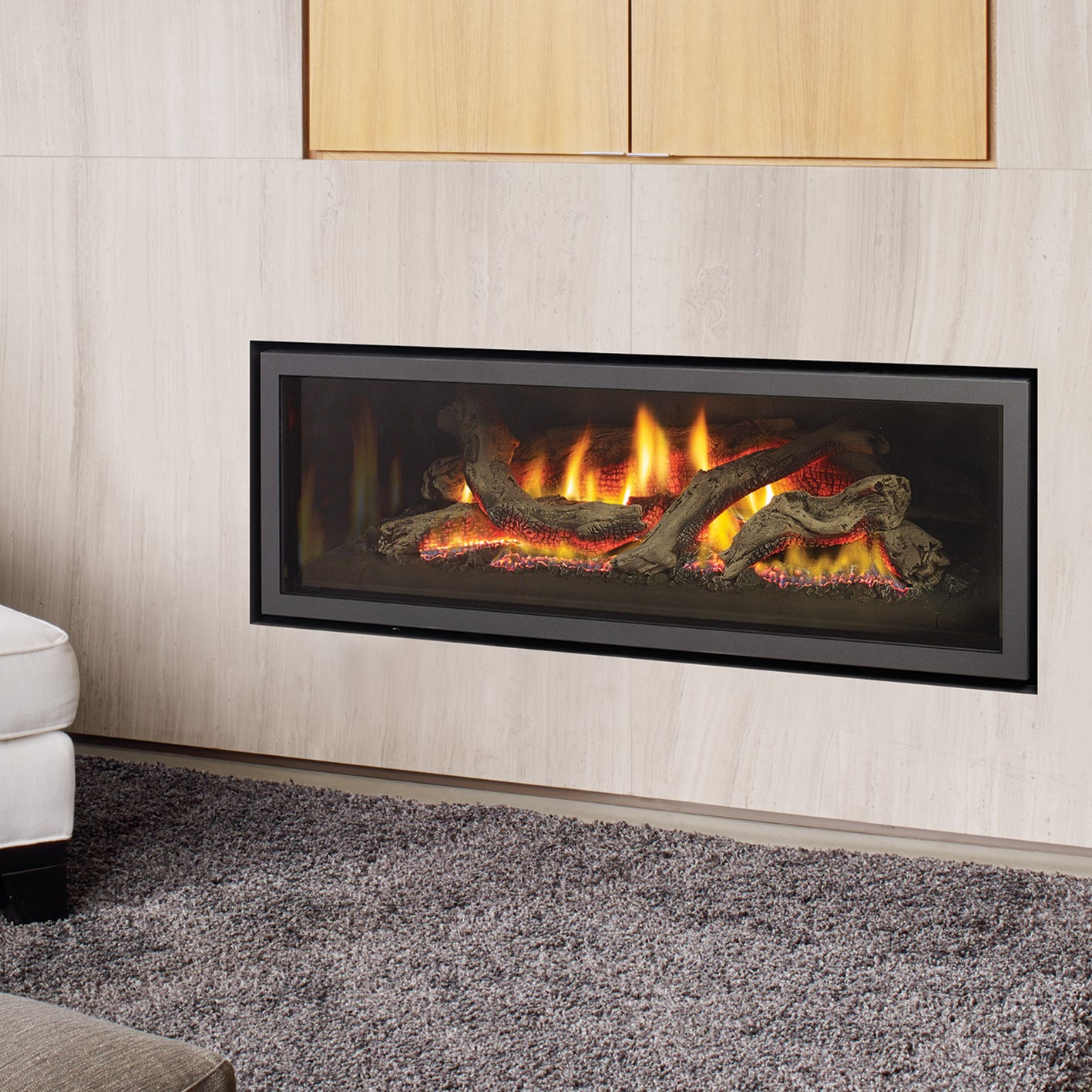 Enjoy a wide landscape view of the most realistic log and glowing ember-bed Regency currently has to offer with the U1500E Ultimate Gas fireplace. The Ultimate series features a seamless design, coastal driftwood logs set on a glowing linear ember-bed and beautiful wide angle flames set in front of reflective back enamel panels emphasize the fire.
